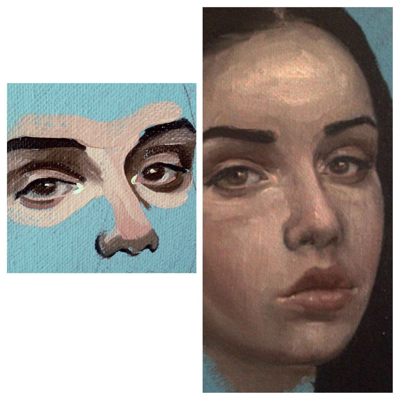 It was surprisingly difficult! I found myself spending much more time carefully selecting colour, brush type and making sure I got bang for buck in each stroke. After the challenge the painting progressed to the image on the right...
