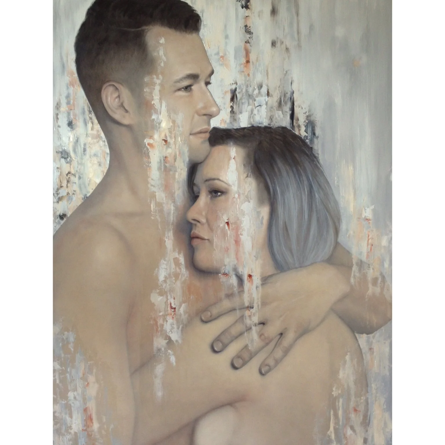 I painted all kinds of couples across the series, all in some kind of embrace, all in a space of pain but not letting the other go. Two figures barely visible through layers of abstraction, just eyes and hands emerging from the paint. A man resting his hand gently on a surface through which another face looks back at him from somewhere unreachable. Two bodies entwined and reaching upward together, her face tilted toward the light. And one painting of my husband and me, his arms around me, both of us looking in slightly different directions, the abstraction falling across us like weather we were standing in together.